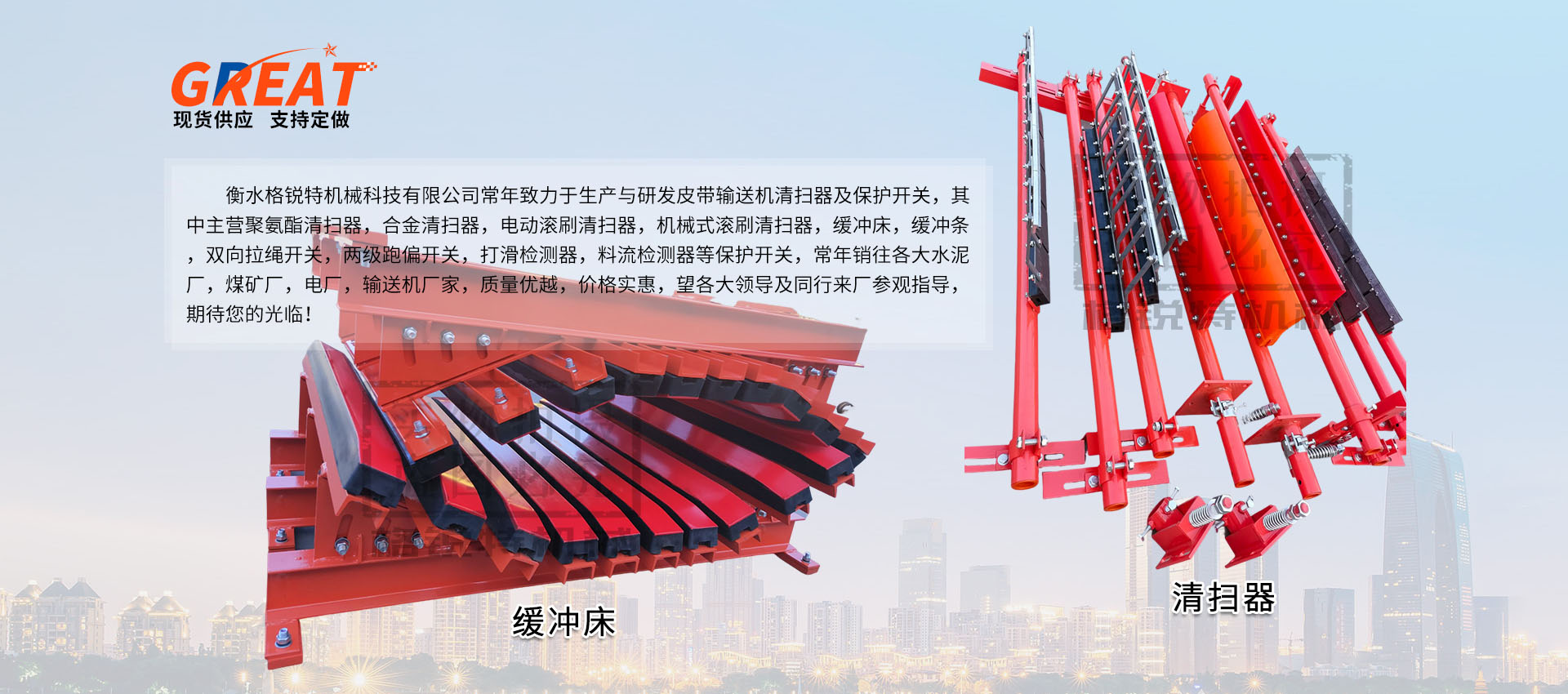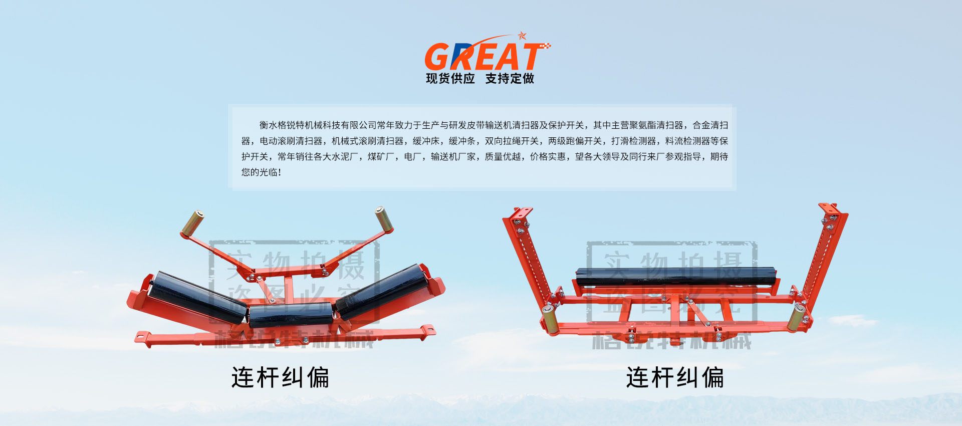 衡水格銳特機械科技有限公司常年致力于生產(chǎn)與研發(fā)皮帶輸送機清掃器及保護開關(guān),其中主營聚氨酯清掃器,合金清掃器,電動滾刷清掃器,機械式滾刷清掃器,緩沖床,緩沖條,雙向拉繩開關(guān),兩級跑偏開關(guān),打滑檢測器,料流檢測器等保護開關(guān),常年銷往各大水泥廠,煤礦廠,電廠,輸送機廠家,質(zhì)量優(yōu)越,價格實惠,望各大領(lǐng)導及同行來廠參觀指導,期待您的光臨!!!